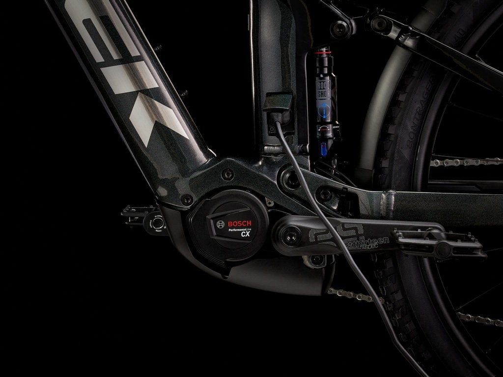 Odolný hliníkový rám se zabudovanou velkokapacitní 625Wh baterií, výkonný motor Bosch Performance CX (250 W, 85 Nm) s dopomocí až do 25 km/h, ovladač chytrého systému s LED a displej Kiox. Pak ještě 120mm odpružená vidlice RockShox Gold RL, tlumič RockShox SID Luxe Select+ se zdvihem 100 mm, účinné čtyřpístkové hydraulické brzdy, kola Bontrager Line Comp 30, 12rychlostní řazení Shimano a teleskopická sedlovka.