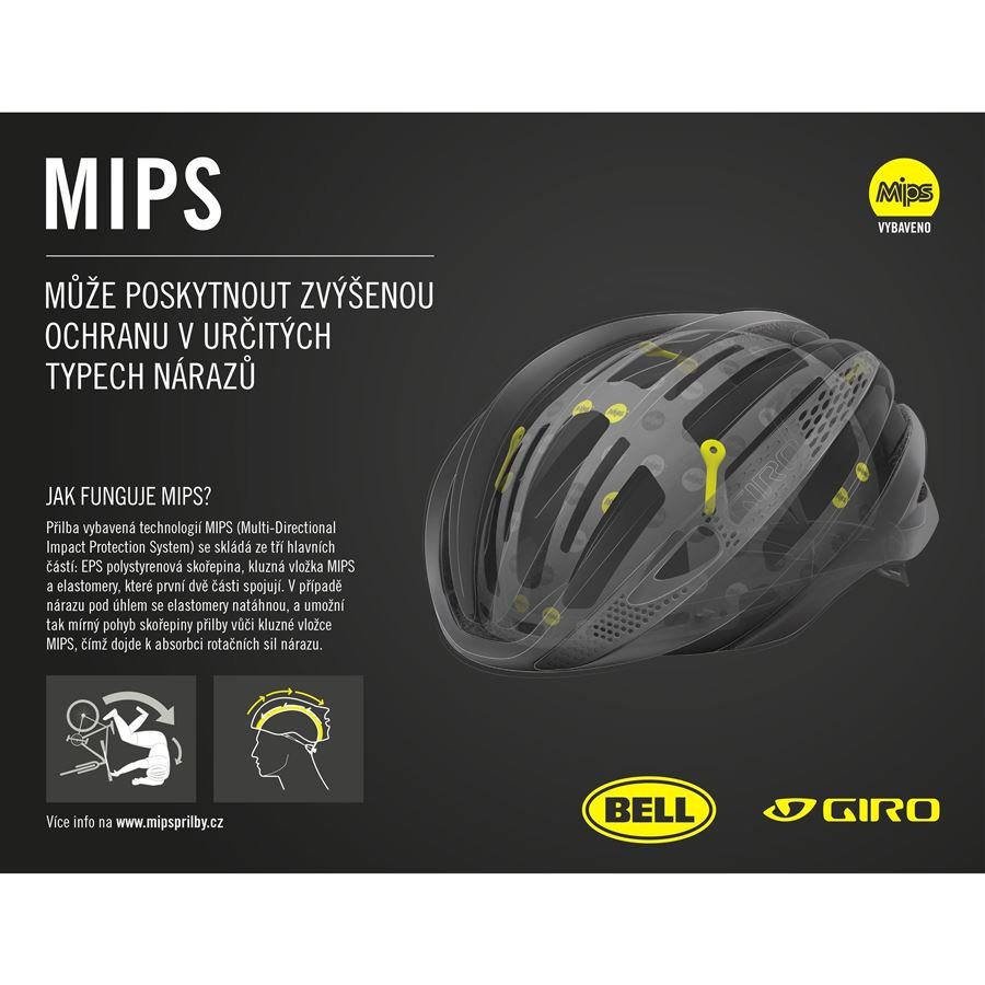 MIPS (Multi-Directional Impact Protection System) poskytuje zvýšenou ochranu proti působení rotačních sil na hlavu. Více na www.MIPSprilby.cz
